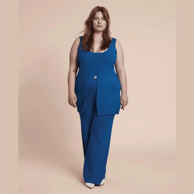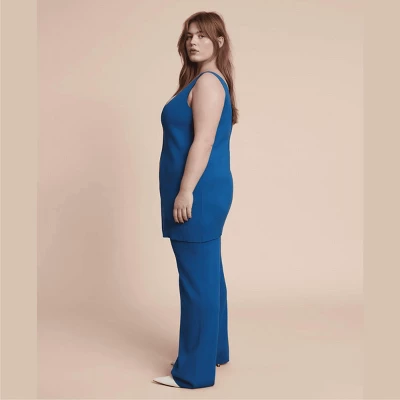 The Celia is a soft knit, high-waisted wide leg pant in cerulean blue. Pair with the matching Christina Sweater Tank for a head-to-toe monochrome moment.