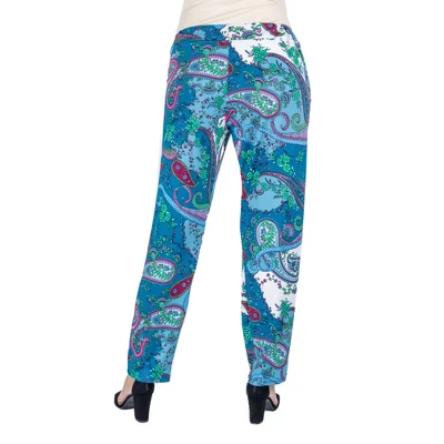 Easily create a sleek yet comfortable look with these beautiful blue paisley print cigarette style trouser pants. Featuring a stretchy elastic waistband, pleating along the front and fitted legs. These stretchy trousers can be worn for a casual day with sneakers for a sporty look or dressed up with heeled sandals. Made from a soft stretch material in a polyester spandex blend.