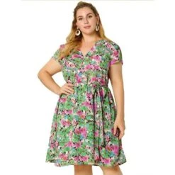 Designed specifically for plus-size women, this dress offers a comfortable and flattering fit that accentuates curves in all the right places. The knee-length design makes it suitable for everyday wear, providing just the right amount of coverage. Featuring short sleeves, this dress ensures breathability and keeps you cool during warmer weather. The floral print adds a feminine touch, creating a playful and stylish look. This dress can be easily dressed up or down depending on the occasion. Pair it with sandals or sneakers for a casual and laid-back daytime ensemble, or dress it up with heels or wedges for a more polished and sophisticated look.