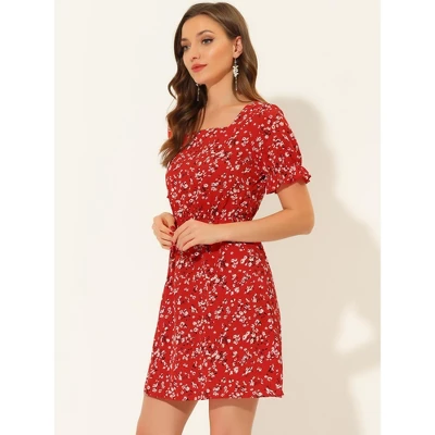 Allegra K Women’s Causal Square Neck Elastic Waist Pocket Mini Floral Puff Sleeve Dress