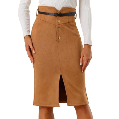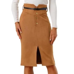 With its a-line silhouette and midi-length hemline, this skirt flatters most body types and can be paired with a variety of tops and shoes. The button-front closure of this skirt makes it easy to wear and provides a classic and timeless look that never goes out of style. The high-rise waistline and front slit add a flattering and trendy element to the overall design of the skirt.
