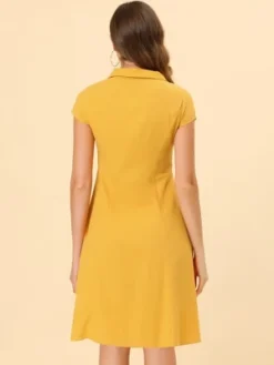 Featuring a button-down finish, this shirt dress is perfect for both formal and casual occasions. The midi length and short sleeves are comfortable and elegant. Made of soft cotton material, this short-sleeved button-up dress ensures you’ll stay comfortable all day long, making it a stunning addition to your modern wardrobe without hesitation. The collar and short sleeves add elegance to your casual or formal look. Fastened with buttons, this dress features an A-line silhouette with a pointed collar, a fitted waist, and a flared hem for an effortlessly elegant silhouette.
