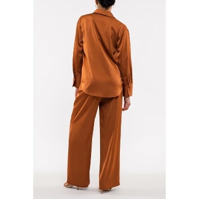 Flaunt elegance and comfort with our August Sky Women’s Solid Satin Wide Leg Pants. The lustrous satin fabric exudes sophistication, while the elastic waistband ensures a perfect fit and all-day ease. Designed with a flattering high waist and trendy wide leg silhouette, these pants effortlessly blend style and versatility. Whether dressing up for a special occasion or aiming for a chic everyday look, these solid-colored pants are the epitome of timeless fashion. Embrace effortless grace and embrace a new level of comfort with these exquisite wide leg pants