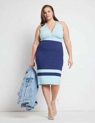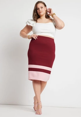 Hidden elastic waistband Column fit Hits below knee Stretch knit ponte Length on model is 28″ Models are size 14 and range in height from 5’9″-5’10″70% Rayon / 26% Nylon / 4% SpandexCare: Machine wash cold gentle cycle with like colors. Only non-chlorine bleach when needed. Do not tumble dry. Lay flat to dry. Cool iron as needed.