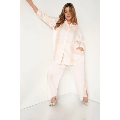 Easy fit UnlinedPull on Full length inseam High rise Inseam = 31″l Elastic at back waist only Slit at hem Non-stretch woven100% PolyesterCare: Machine wash cold gentle cycle with like colors. Only non-chlorine bleach when needed. Tumble dry low. Cool iron as needed.