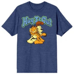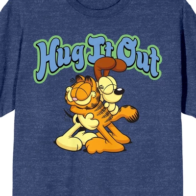 - CUSTOM DESIGN: Garfield and Odie hug each other on this graphic tee while blue letters above the character spell out, “Hug It Out.” Fans of the Garfield comic strip characters will love this fun custom design.