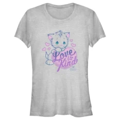 This lovely, officially licensed Precious Moments Love is Kind Juniors’ Tee is sure to bring you happiness with these soft illustrations of children with teardrop-shaped eyes inspired by faith, family, and friends! This adorable design features a kitten resting its paws on a heart with the words “Love is Kind.” These new graphic tees are perfect for the whole family, so grab one for yourself or a loved one today!