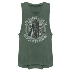 Stop looking for St. Patty’s Day attire in Alderaan places! Add a little out-of-this-world style to your wardrobe with this officially licensed Star Wars I Find Your Lack of Green Disturbing Juniors’ Festival Muscle Tank Top! This cool design features Darth Vader and two Stormtroopers encircled by “I Find Your Lack Of Green Disturbing.” Get ready to be the center of attention at the St. Patrick’s Day celebration with this epic new Star Wars graphic tank top!