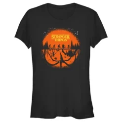 - Strut your stuff with this stylish new everyday Juniors’ T-Shirt that is perfect for every occasion! Featuring both the real world and the upside down with the silhouettes of Eleven, Lucas, Mike, Dustin, Max, Will, and the monsters from the upside down the Demogorgon, Demobat Mind Flayer with a cool orange background!