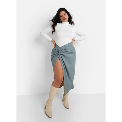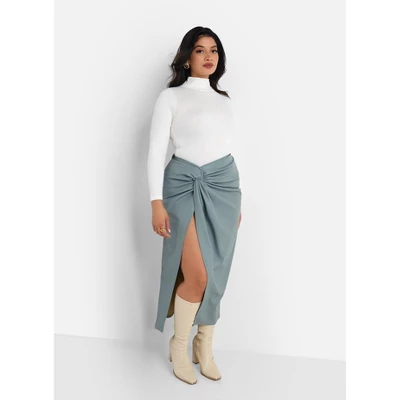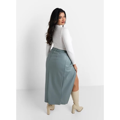 This skirt is made of vegan leather and featured a front twist and high thigh slit