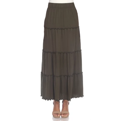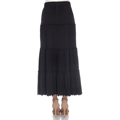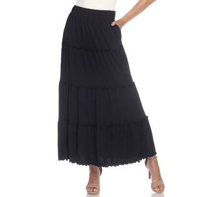 Achieve just the right amount of flounce appeal with this boho inspired lightweight tiered midi skirt. Features an elastic waistband, midrise (or high-rise depending on desired skirt length), pockets at side, tiered trims with soft pleats, A-Line silhouette, and ruffled hemline. Made with a polyester and spandex thin single layer stretchy blend for a breathable and comfortable fit. Pairs great with a tank or layered blouse for a classic beach look.