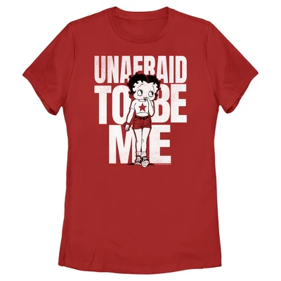 - Strut your stuff with this stylish new women’s t-shirt that is perfect for every occasion! Featuring Betty Boop with the text: “Unafraid to Be Me,” in the background and big bold letters across the front.