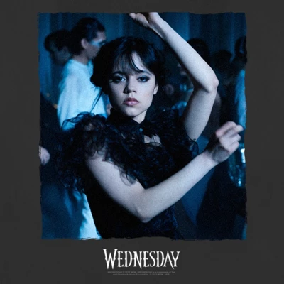 Join Wednesday Addams, the death-obsessed daughter from the iconic Addams Family franchise as she attends Nevermore Academy, hones her psychic abilities, and solves age-old mysteries in the spooky new series Wednesday from Netflix! This officially licensed Wednesday Dance Scene Women’s Graphic T-Shirt features a picture from the iconic dancing scene across the front along with the series’ logo at the bottom. Get some new Wednesday designs and embrace the darkness!